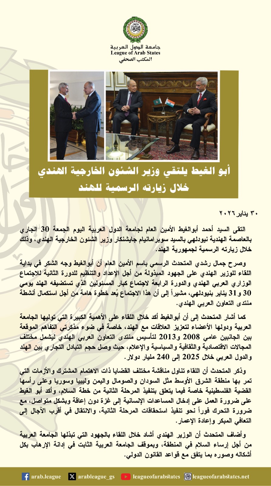 التقى أحمد أبو الغيط الأمين العام لجامعة الدول العربية، اليوم الجمعة 30 يناير 2026، بالعاصمة الهندية نيودلهي، بسوبراهمانيام جايشانكار، وزير الشؤون الخارجية الهندي، وذلك في إطار الزيارة الرسمية التي يقوم بها أبو الغيط إلى جمهورية الهند.