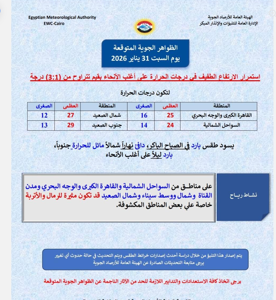 أعلنت هيئة الأرصاد الجوية، تفاصيل الظواهر الجوية المتوقعة، حول الطقس غدًا السبت الموافق 31 يناير 2026، مشيرة إلى استمرار الارتفاع الطفيف في درجات الحرارة على أغلب الأنحاء بقيم تتراوح من (1:3) درجات.