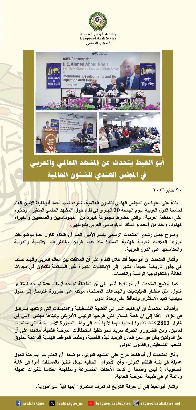شارك أحمد أبو الغيط، الأمين العام لجامعة الدول العربية، في لقاء نظمّه المجلس الهندي للشؤون العالمية، يوم الجمعة 30 يناير 2026، تناول خلاله المشهد العالمي المتغير وتأثيره على المنطقة العربية، وذلك بحضور نخبة من الدبلوماسيين والصحفيين والخبراء الهنود، إلى جانب عدد من أعضاء السلك الدبلوماسي العربي في نيودلهي.