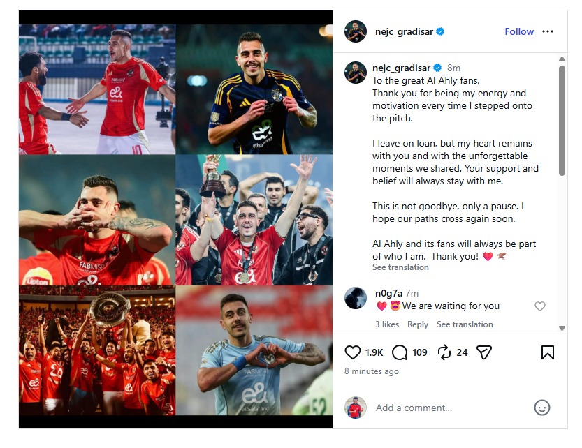 وجّه السلوفيني جراديشار لاعب الأهلي رسالة وداع مؤثرة إلى جماهير القلعة الحمراء، وذلك قبل رحيله إلى نادي أوفيشت المجري على سبيل الإعارة خلال فترة الانتقالات الحالية.