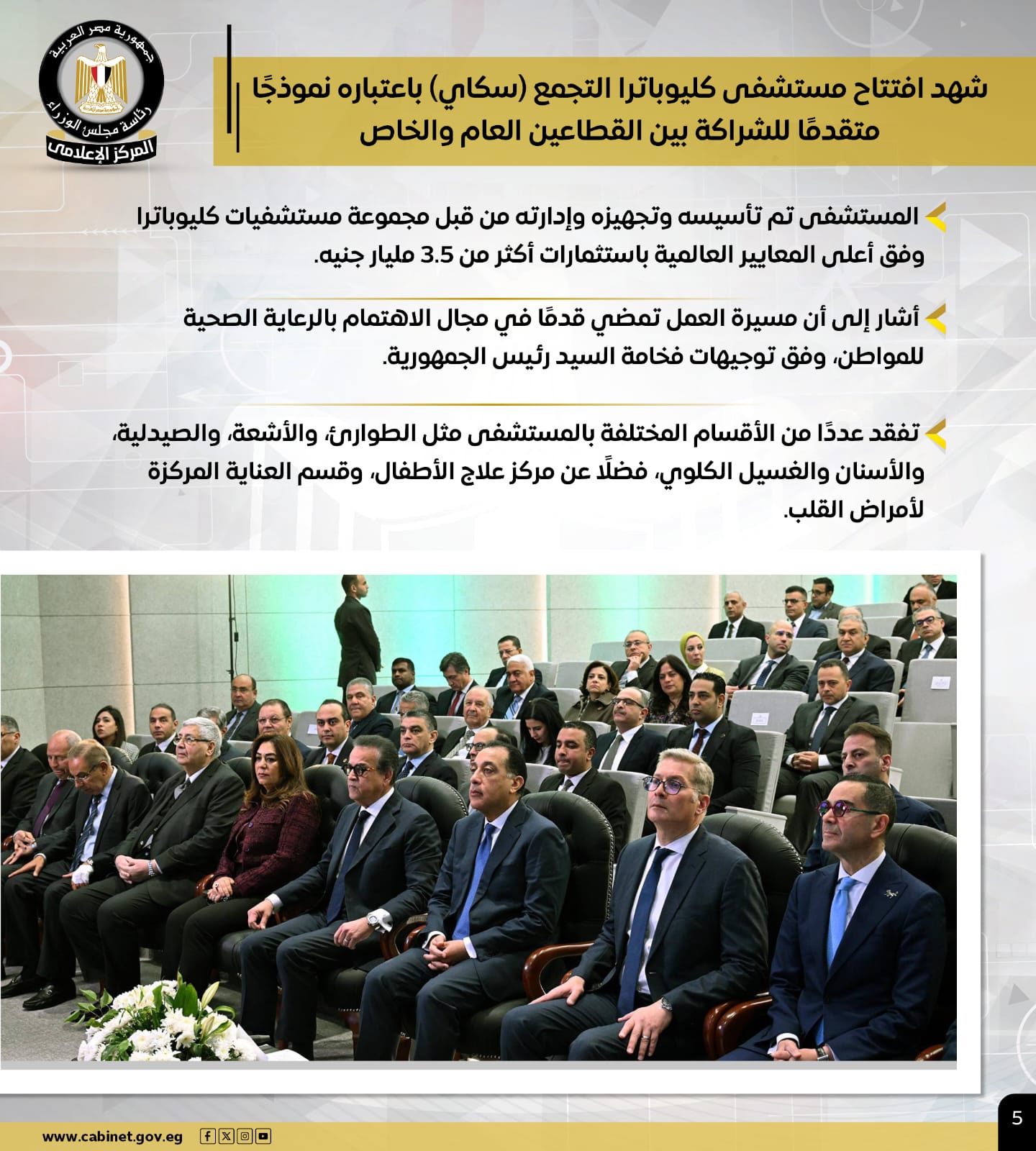 كما شهد رئيس الوزراء افتتاح مستشفى كليوباترا التجمع (سكاي) كنموذج متقدم للشراكة بين القطاعين العام والخاص، حيث تم تأسيسه وتجهيزه وإدارته وفق أعلى المعايير العالمية باستثمارات تتجاوز 3.5 مليار جنيه، وأكد خلال جولته التفقدية بالمستشفى، التي شملت عددًا من الأقسام المختلفة، أن الدولة ماضية قدمًا في دعم منظومة الرعاية الصحية للمواطنين وفق توجيهات فخامة الرئيس.