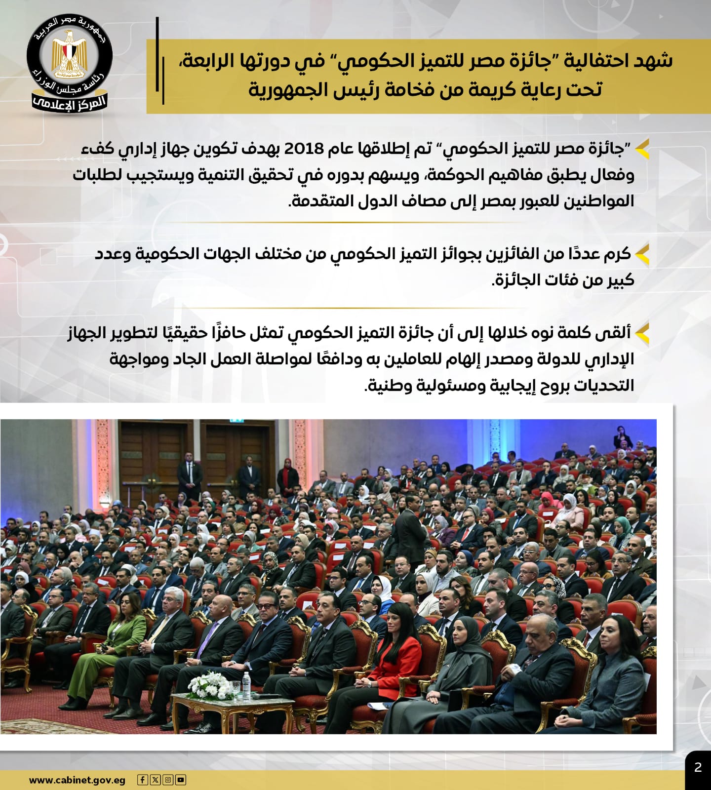 وشهد رئيس الوزراء احتفالية "جائزة مصر للتميز الحكومي" في دورتها الرابعة، تحت رعاية فخامة الرئيس، والتي تم إطلاقها عام 2018 بهدف تكوين جهاز إداري كفء وفعال يطبق مفاهيم الحوكمة، ويسهم بدوره في تحقيق التنمية ويستجيب لطلبات المواطنين للعبور بمصر إلى مصاف الدول المتقدمة.