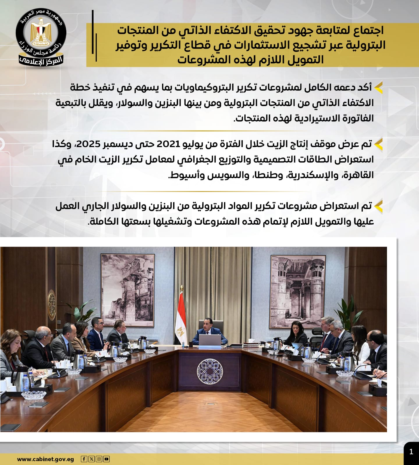 وتضمنت الأنشطة، اجتماعًا لرئيس الوزراء لمتابعة جهود تحقيق الاكتفاء الذاتي من المنتجات البترولية، عبر تشجيع الاستثمارات في قطاع التكرير وتوفير التمويل اللازم لهذه المشروعات، مؤكدًا دعمه الكامل لمشروعات تكرير البتروكيماويات بما يسهم في تنفيذ خطة الاكتفاء الذاتي من المنتجات البترولية، ومن بينها البنزين والسولار، الأمر الذي يقلل بالتبعية الفاتورة الاستيرادية لهذه المنتجات.