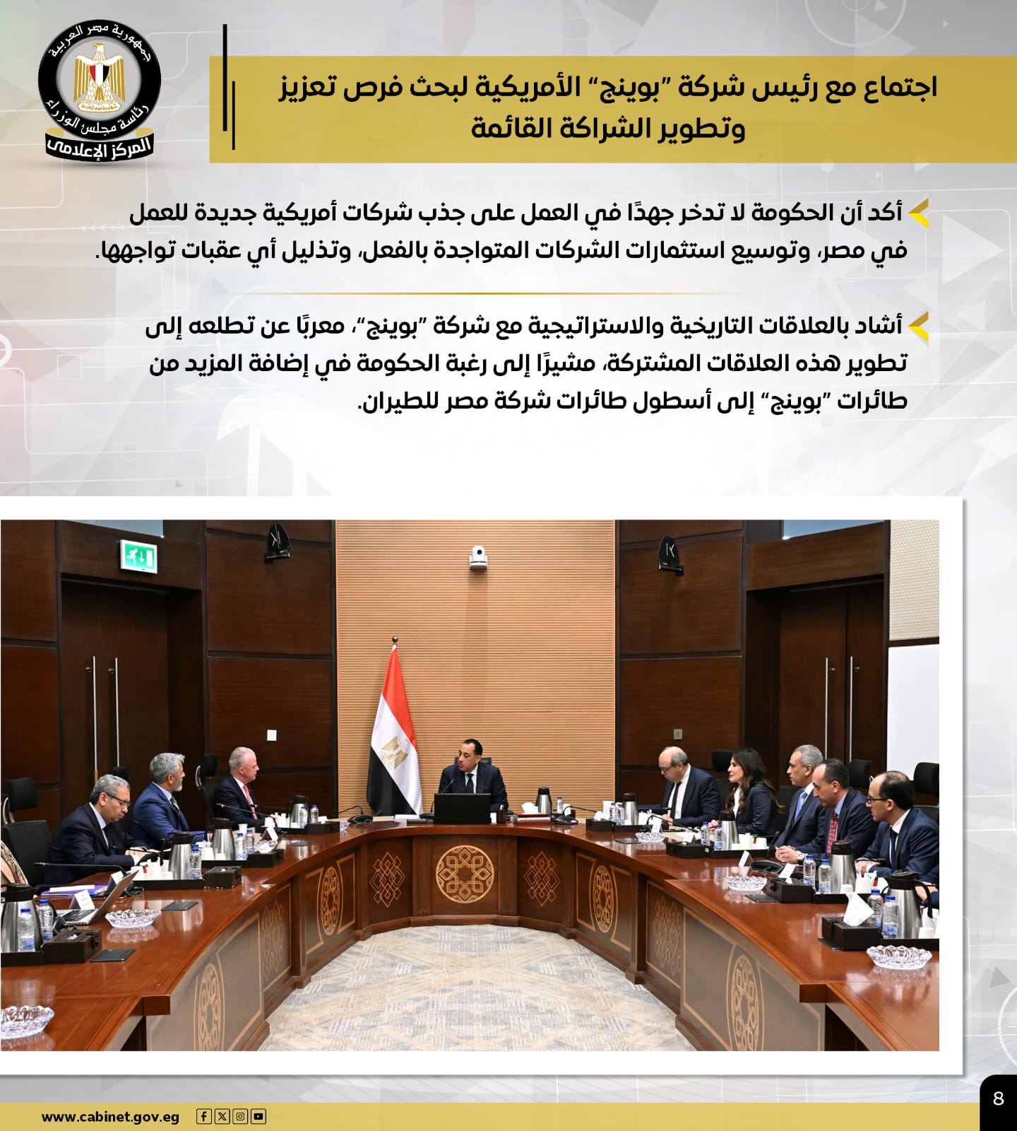 كما عقد اجتماعًا مع رئيس شركة "بوينج" الأمريكية، لبحث فرص تعزيز وتطوير الشراكة القائمة، مؤكدًا أن الحكومة لا تدخر جهدًا في العمل على جذب شركات أمريكية جديدة للعمل في مصر، وتوسيع استثمارات الشركات القائمة وتذليل أي عقبات تواجهها.