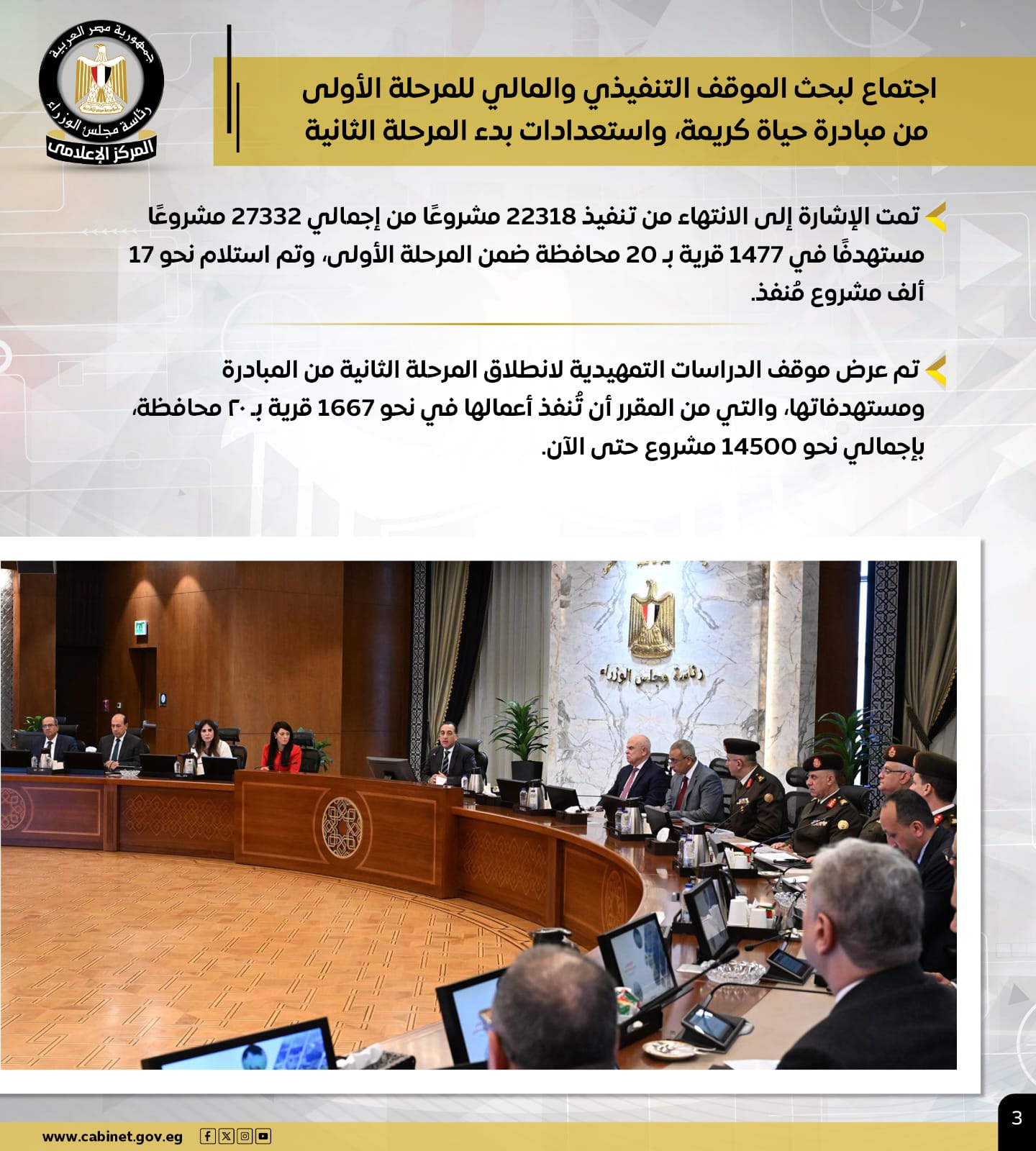 كما عقد رئيس الوزراء اجتماعًا لبحث الموقف التنفيذي والمالي للمرحلة الأولى من مبادرة "حياة كريمة"، واستعدادات بدء المرحلة الثانية، وتمت الإشارة إلى الانتهاء من تنفيذ 22318 مشروعًا من إجمالي 27332 مشروعًا مستهدفًا في 1477 قرية بـ 20 محافظة ضمن المرحلة الأولى، واستلام نحو 17 ألف مشروع.