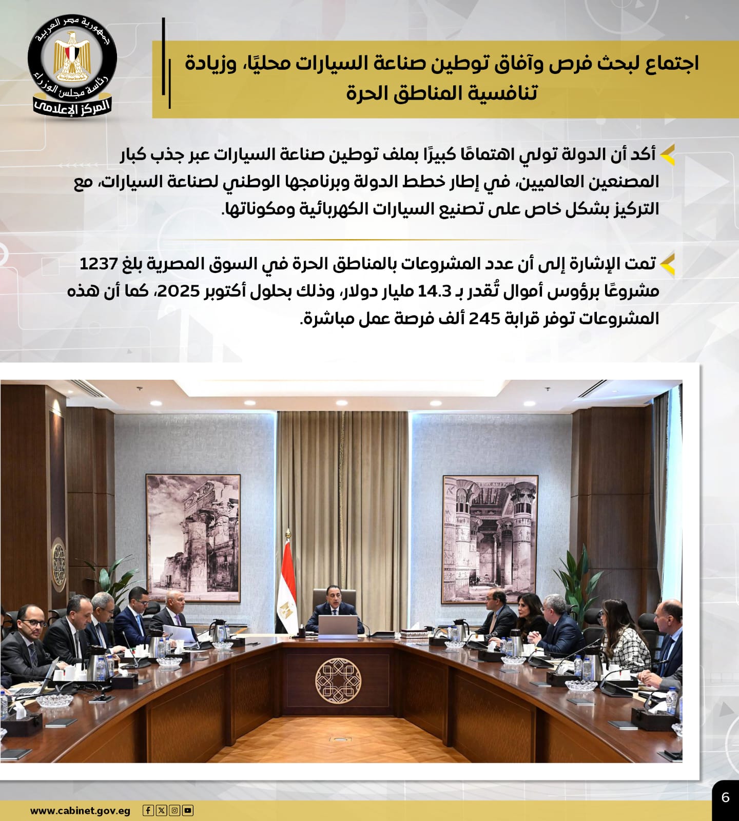 وعقد رئيس الوزراء اجتماعًا لبحث فرص وآفاق توطين صناعة السيارات محليًا، وزيادة تنافسية المناطق الحرة، مؤكدًا أن الدولة تولي اهتمامًا كبيرًا بملف توطين صناعة السيارات عبر جذب كبار المصنعين العالميين، خاصة في مجال تصنيع السيارات الكهربائية ومكوناتها، في إطار البرنامج الوطني لصناعة السيارات.