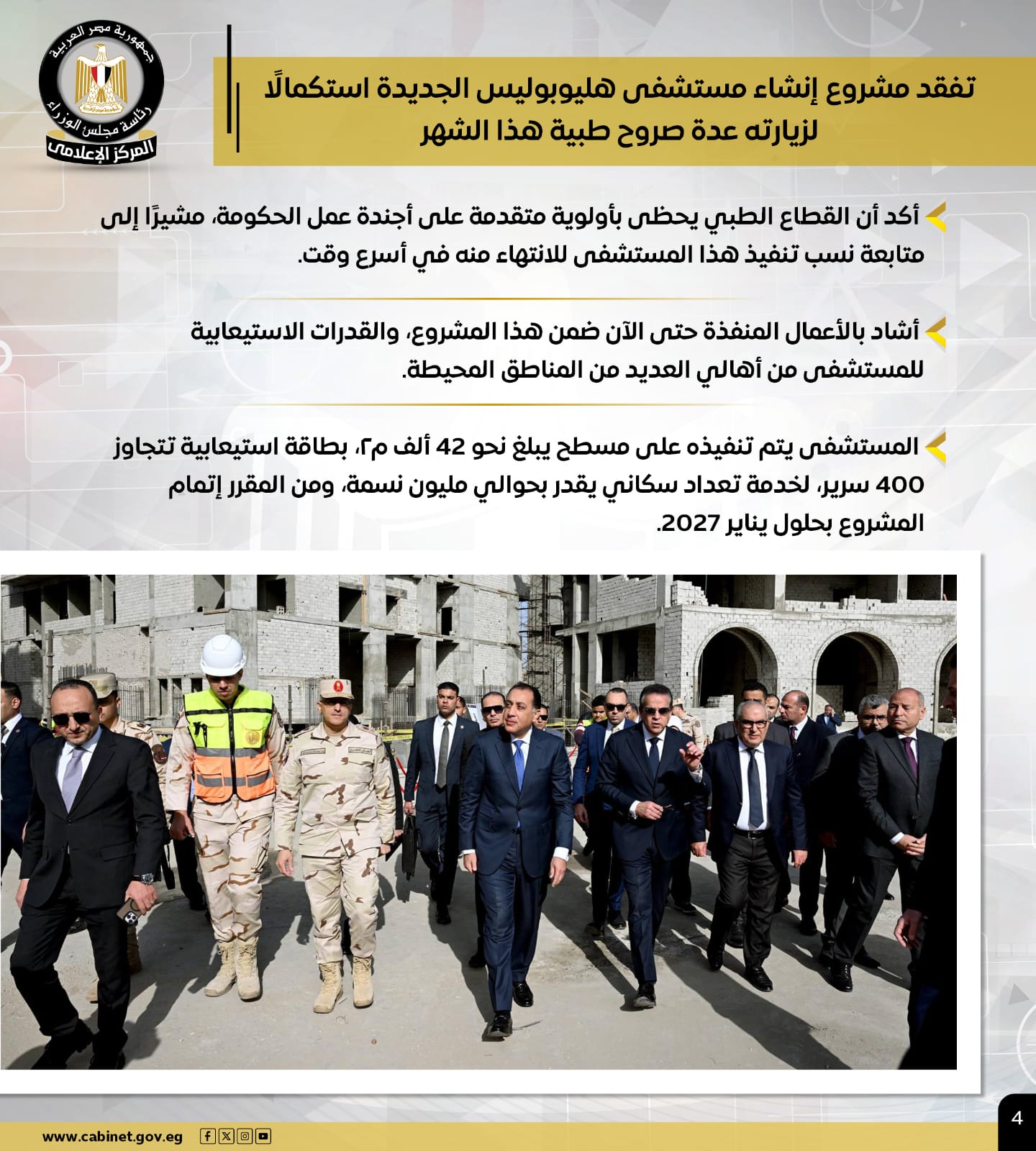وأشاد بمستوى الأعمال المنفذة حتى الآن والقدرات الاستيعابية للمستشفى، الذي يُقام على مساحة نحو 42 ألف م2، بطاقة تتجاوز 400 سرير، لخدمة نحو مليون نسمة، ومن المقرر الانتهاء منه بحلول يناير 2027.