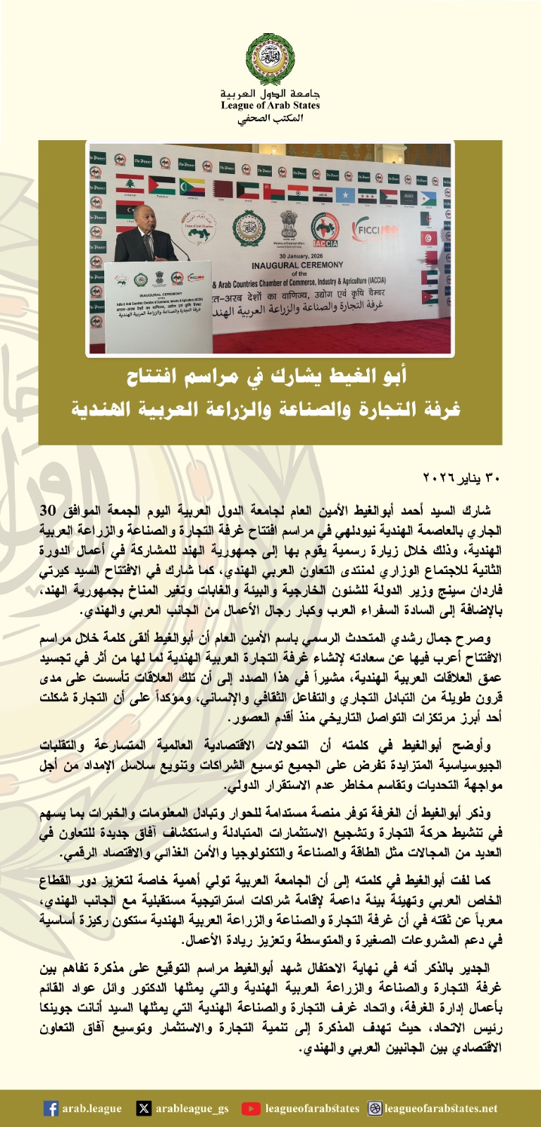 كما لفت أبو الغيط في كلمته إلى أن الجامعة العربية تولي أهمية خاصة لتعزيز دور القطاع الخاص العربي وتهيئة بيئة داعمة لإقامة شراكات استراتيجية مستقبلية مع الجانب الهندي، معرباً عن ثقته في أن غرفة التجارة والصناعة والزراعة العربية الهندية ستكون ركيزة أساسية في دعم المشروعات الصغيرة والمتوسطة وتعزيز ريادة الأعمال.
