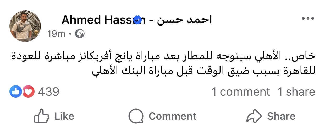 وكتب أحمد حسن على حسابه الشخصي بموقع فيسبوك: “الأهلي سيتوجه للمطار بعد مباراة يانج أفريكانز مباشرة للعودة للقاهرة بسبب ضيق الوقت قبل مباراة البنك الأهلي".