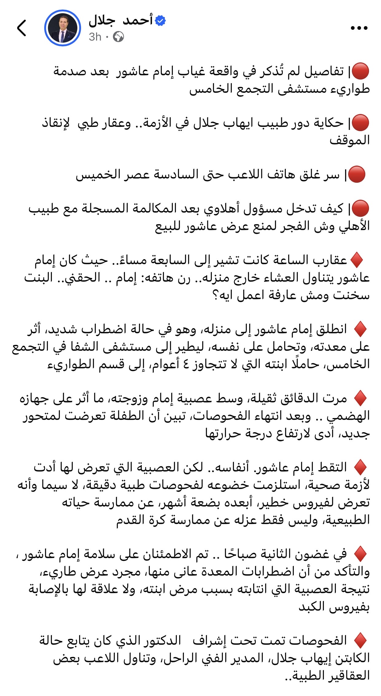 وأضاف أن الأطباء أكدوا في الثانية صباحًا أن ما تعرض له إمام عاشور مجرد اضطرابات بالمعدة ناتجة عن العصبية، ولا علاقة لها بإصابته السابقة بفيروس الكبد، وتم علاجه ببعض العقاقير الطبية تحت إشراف الطبيب الذي كان يتابع حالة المدير الفني الراحل إيهاب جلال.