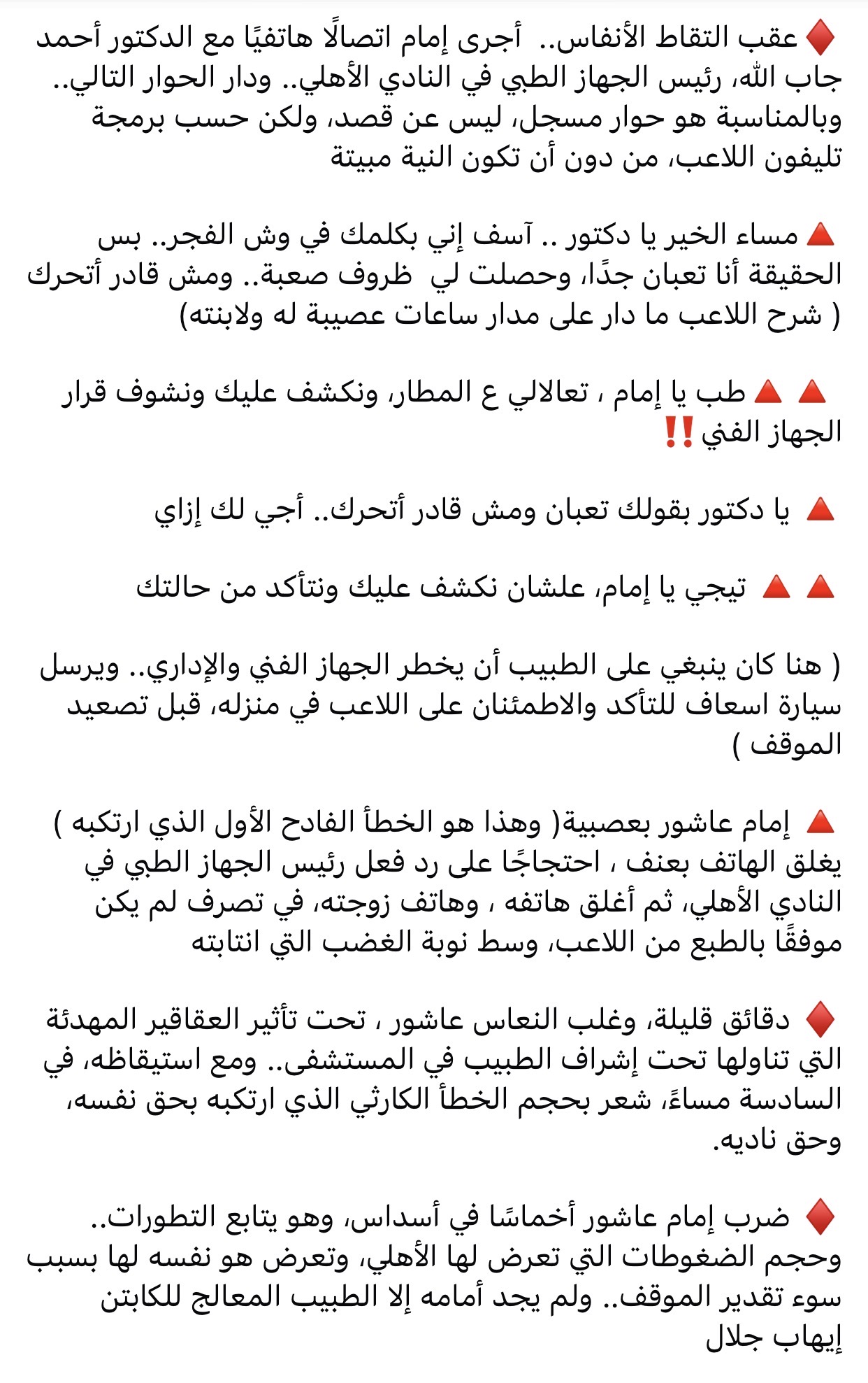 وكشف أحمد جلال عن مكالمة هاتفية مسجلة  دون قصد بين إمام عاشور والدكتور أحمد جاب الله رئيس الجهاز الطبي بالأهلي، أبلغ خلالها اللاعب طبيب الفريق بعدم قدرته على الحركة بسبب حالته الصحية والظروف التي مر بها، إلا أن رد الجهاز الطبي بطلب حضور اللاعب للكشف عليه قبل اتخاذ قرار فني، تسبب في توتر اللاعب وغضبه، لينهي المكالمة ويغلق هاتفه وهاتف زوجته.