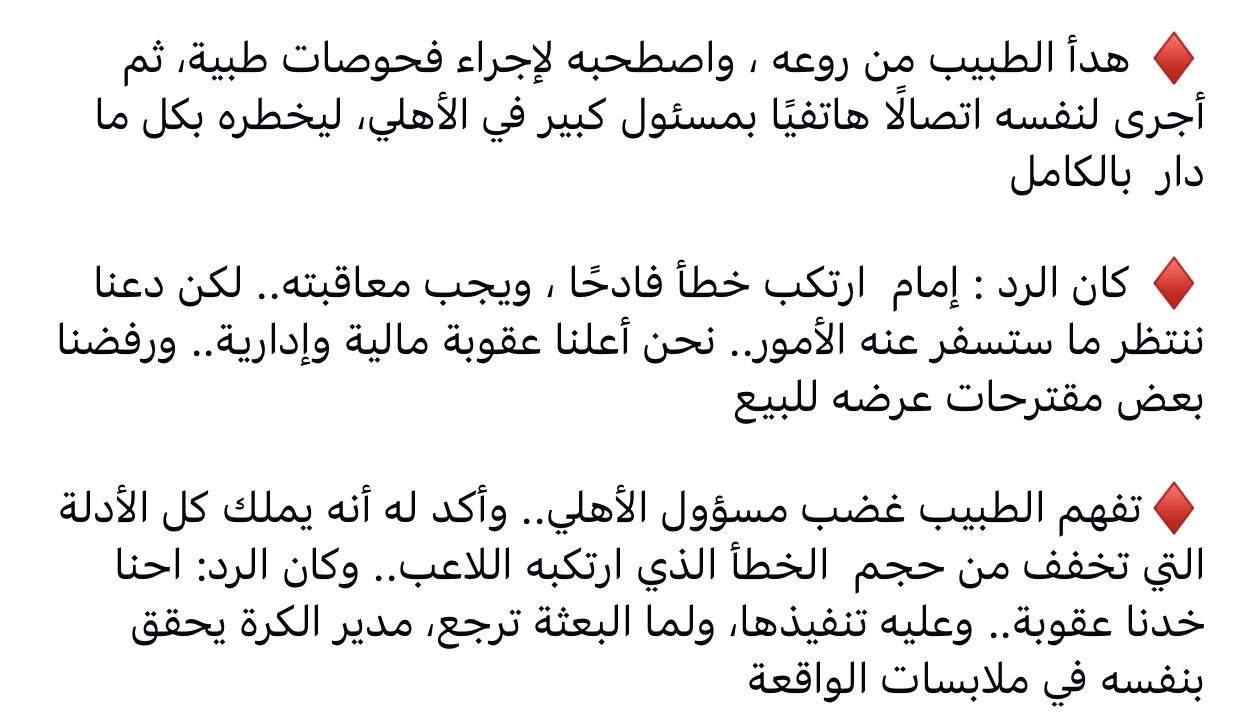 وأوضح أن إمام عاشور دخل في نوبة نوم عميق نتيجة الأدوية المهدئة، ليستيقظ في السادسة مساء الخميس، ويكتشف حجم الأزمة التي تفجرت، ليشعر بخطأ تصرفه، ويتواصل مجددًا مع الطبيب المعالج، الذي اصطحبه لإجراء فحوصات جديدة، قبل أن يتواصل بنفسه مع مسؤول كبير في الأهلي ويشرح له ملابسات الواقعة كاملة.