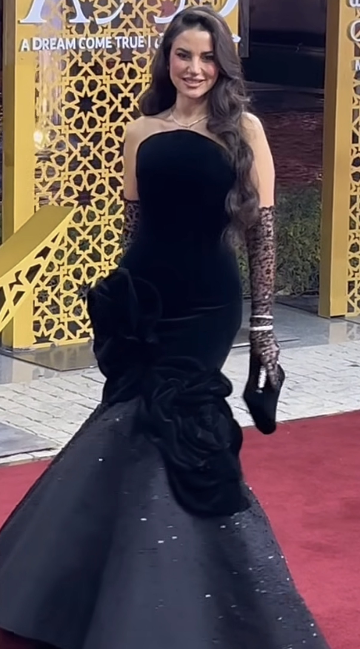 ظهرت درة في الحفل بإطلالة بإطلالة ملفتة، حيث ارتدت فستان طويل اتسم الجزء العلوي باللون الأسود المصنوع من القماش المخملي أما الجزء السفلي بالقماش المطرز.