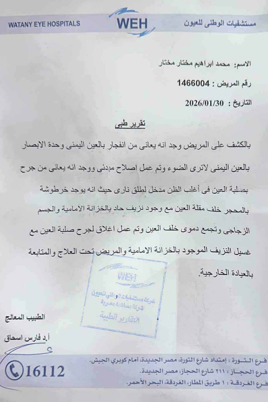 وأوضحت التقارير الطبية أن المجني عليه جرى نقله لتلقي العلاج، وبالكشف الطبي تبين معاناته من انفجار بالعين اليمنى، وفقدان تام للإبصار بها وعدم القدرة على رؤية الضوء، وتم إجراء إصلاح مبدئي، كما تبين وجود جرح بصلبة العين يُرجح كونه مدخلًا لطلق ناري، مع وجود خرطوشة بالمحجر خلف مقلة العين، ونزيف حاد بالخزانة الأمامية والجسم الزجاجي، وتجمع دموي خلف العين، وتم غلق جرح صلبة العين وغسيل النزيف الموجود بالخزانة الأمامية، ولا يزال المصاب تحت العلاج والمتابعة بالعيادة الخارجية.