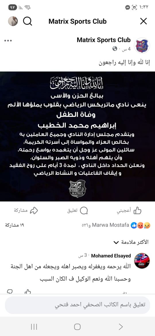 أعلن مجلس إدارة نادي ماتريكس الرياضي بطنطا اليوم الحداد لمده 3 ايام حزنا علي وفاة طالب في أوائل العقد الثاني من عمره بسبب سقوط عارضة الملعب أثناء لهوه.