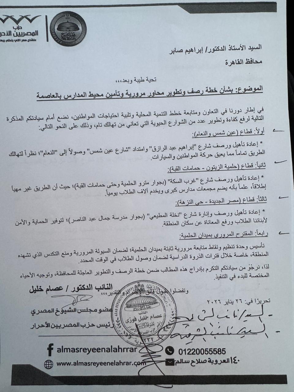 تقدّم الدكتور عصام خليل، عضو مجلس الشيوخ ورئيس حزب المصريين الأحرار، بمذكرة عاجلة إلى الدكتور إبراهيم صابر، محافظ القاهرة، طالب فيها بإدراج مجموعة من الشوارع والمحاور الحيوية بشرق العاصمة ضمن خطة الرصف والتطوير العاجلة، ووجه المحافظ الجهات المختصة للعمل.
