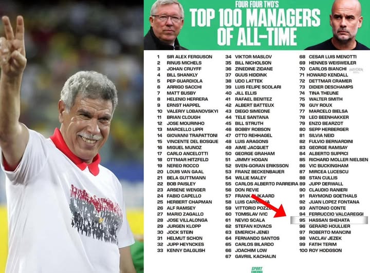 دخل حسن شحاتة، المدير الفني الأسبق لمنتخب مصر، قائمة أفضل 100 مدرب كرة قدم عبر التاريخ، وفقًا لتصنيف صحيفة «Four Four Two» الإنجليزية الشهيرة.