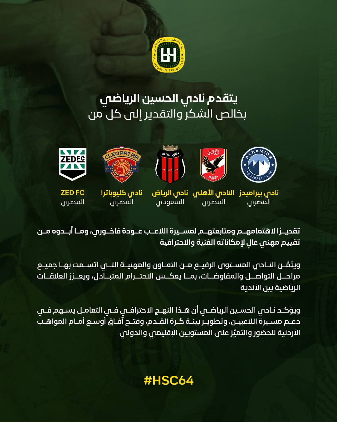 وأشار نادي الحسين الرياضي إلى أن هذا الأسلوب الاحترافي في التعامل يصب في مصلحة اللاعبين، ويسهم في تطوير بيئة كرة القدم، ويدعم مسيرة الأندية في صناعة وتقديم المواهب.