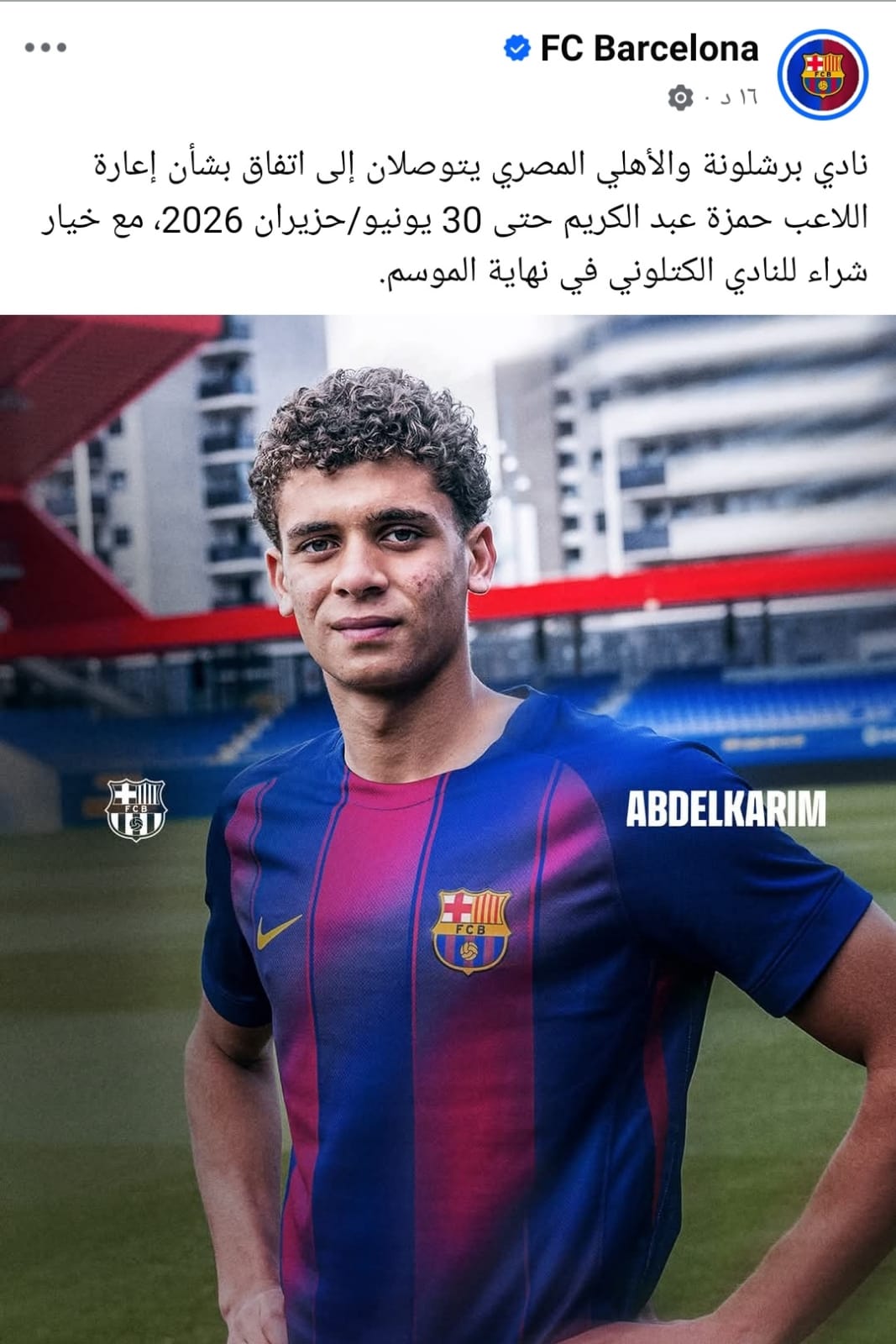 وكتب الحساب الرسمي لنادي برشلونة: «نادي برشلونة والأهلي المصري يتوصلان إلى اتفاق بشأن إعارة اللاعب حمزة عبد الكريم حتى 30 يونيو 2026، مع خيار شراء للنادي الكتلوني في نهاية الموسم».