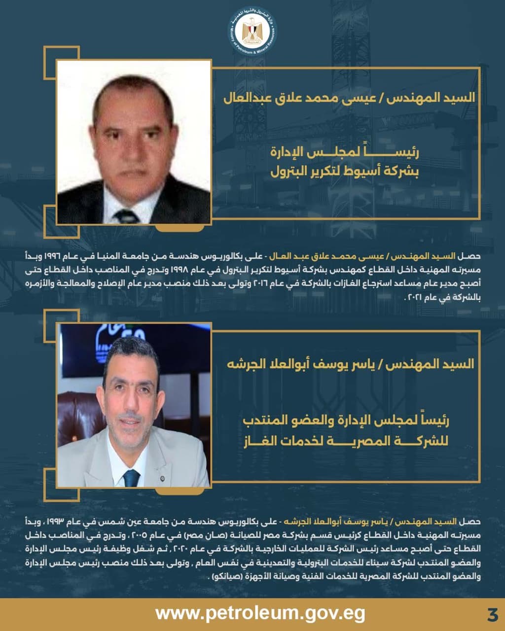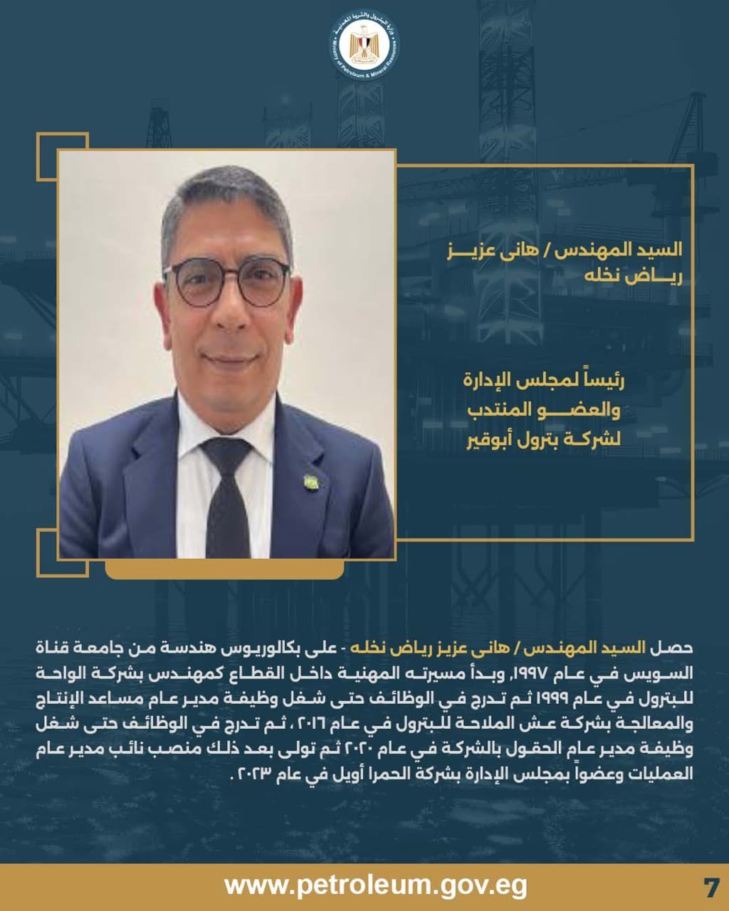 وكلف الوزير المهندس أحمد صلاح الدين سيد عبد الرحمن رئيساً لمجلس الإدارة والعضو المنتدب لشركة شمال البحرية للبترول.