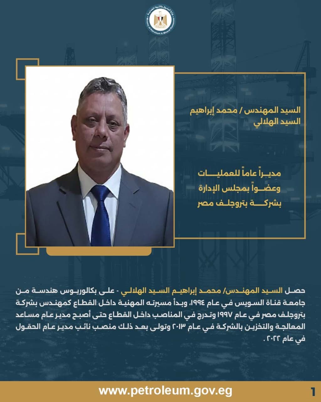 وتم تكليف المهندس السيد أحمد السيد علي رجب نائباً لمدير عام العمليات وعضوا بمجلس الإدارة بشركة الحمرا أويل