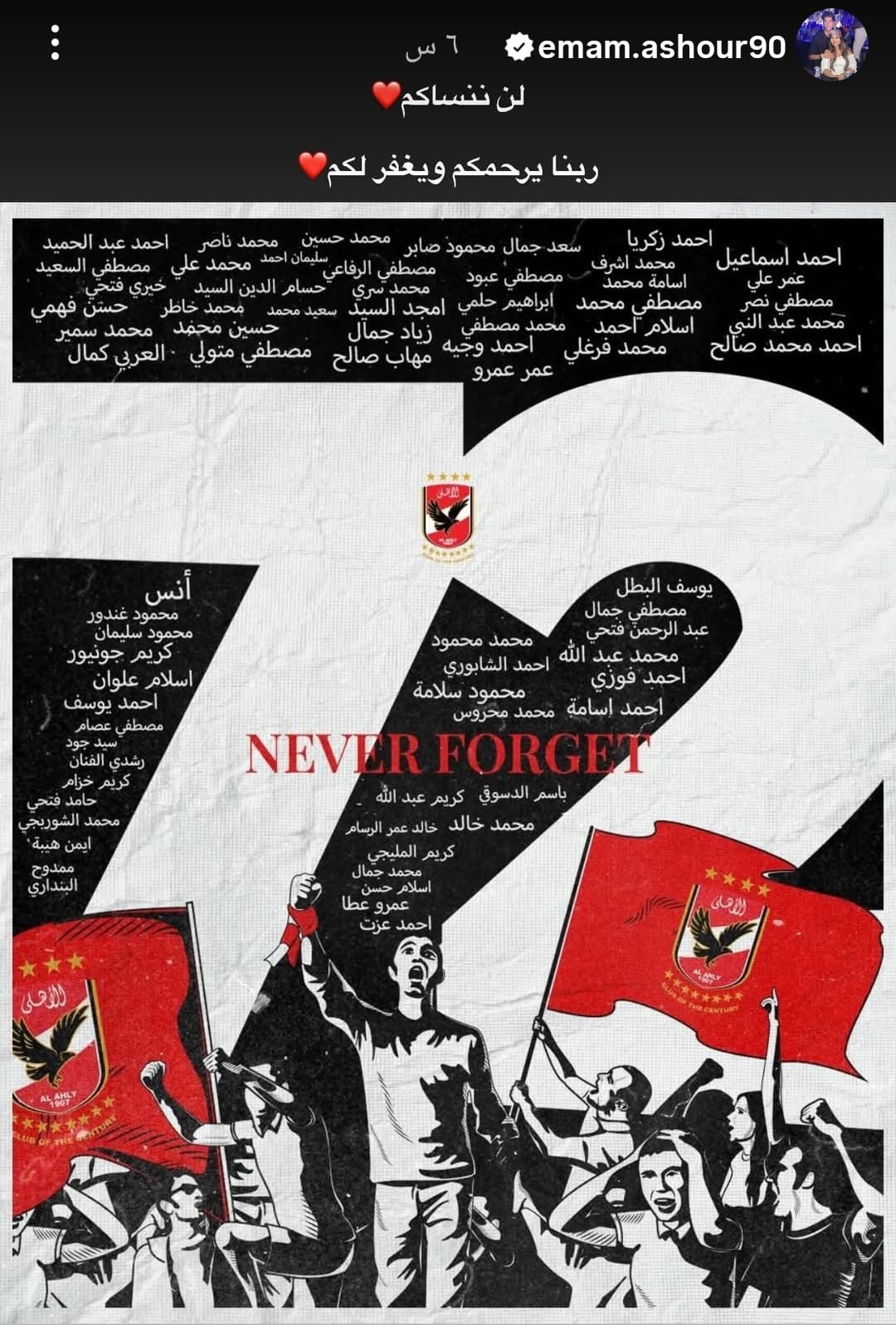 ونشر إمام عاشور، صورة لأسماء الـ72 مشجعًا من جمهور الأهلي، واللذين لاقوا حتفهم مثل هذا اليوم في أحداث بورسعيد وكتب إمام عاشور: "لن ننساكم".