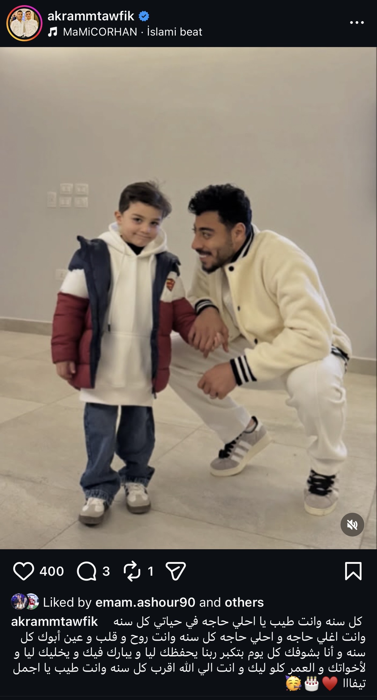 ونشر توفيق صورة تجمعهما سويًا عبر حسابه الشخصي بموقع إنستجرام وعلق عليها قائلاً: “كل سنه وانت طيب يا احلي حاجه في حياتي كل سنه، وانت اغلي حاجه و احلي حاجه كل سنه وانت روح و قلب و عين أبوك كل سنه وأنا بشوفك كل يوم بتكبر ربنا يحفظك ليا ويبارك فيك و يخليك ليا و لأخواتك والعمر كلو ليك و انت الي اللّٰه اقرب كل سنه وانت طيب يا اجمل تيفا”.