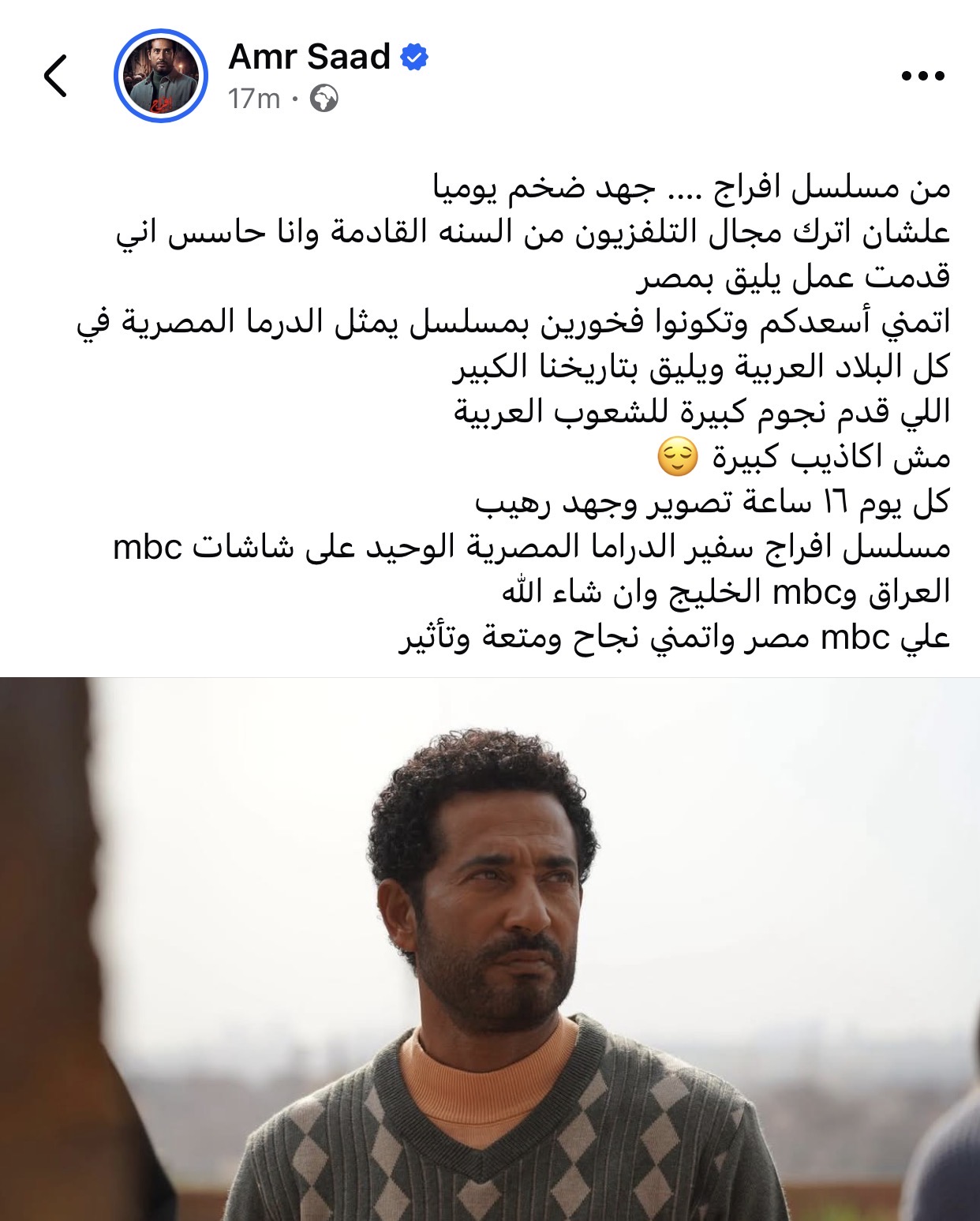كشف الفنان عمرو سعد، عبر حسابه على موقع التواصل الاجتماعي فيسبوك، عن كواليس العمل في مسلسل «إفراج»، مؤكدًا أن العمل استغرق مجهودًا كبيرًا وتصويرًا يوميًا امتد إلى نحو 16 ساعة.