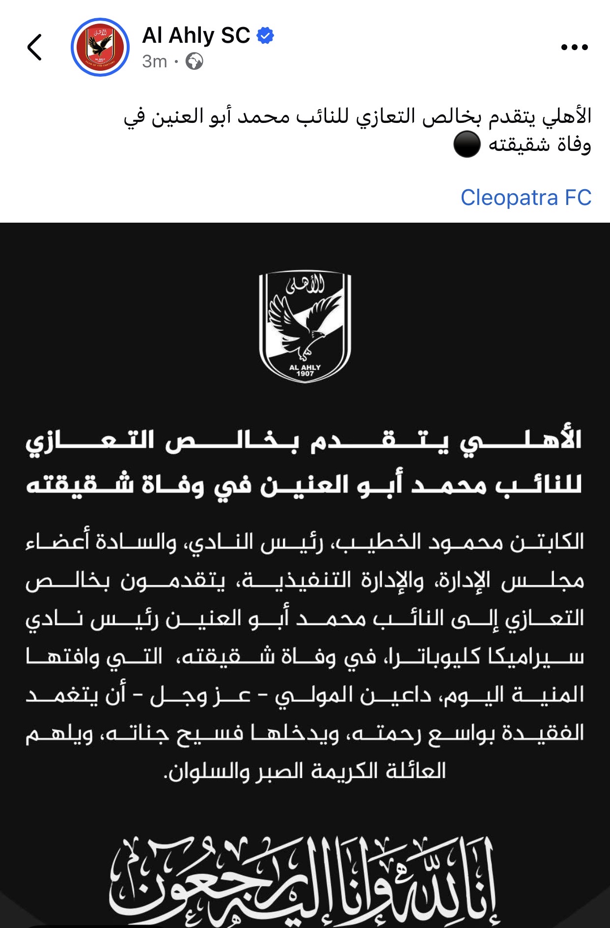 تقدم الكابتن محمود الخطيب، رئيس النادي الأهلي، و أعضاء مجلس الإدارة، والإدارة التنفيذية، بخالص التعازي إلى النائب محمد أبو العنين، رئيس نادي سيراميكا كليوباترا، في وفاة شقيقته التي وافتها المنية اليوم.