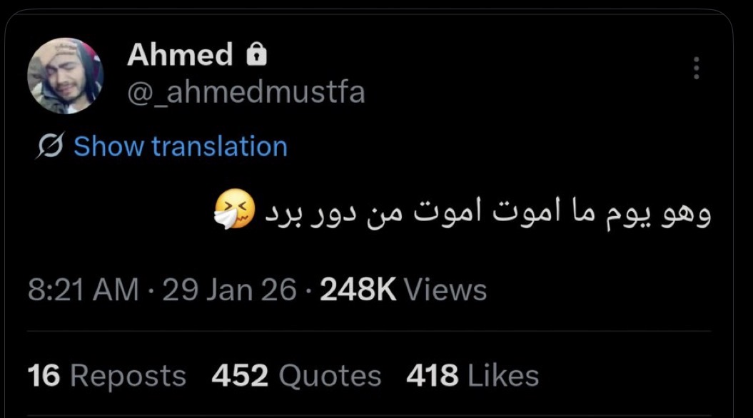 كما أعاد المتابعون تداول آخر ما كتبه الفقيد على حسابه بمنصة «إكس»، والذي جاء فيه: «وهو يوم ما أموت.. أموت من دور برد»