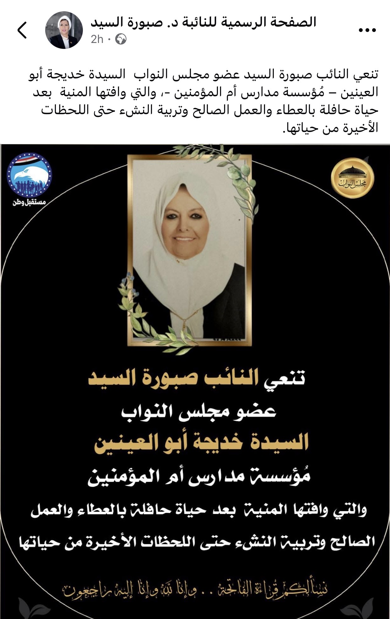 نعت النائبة صبورة السيد، عضو مجلس النواب، السيدة خديجة أبو العينين، مؤسسة مدارس أم المؤمنين، التي وافتها المنية بعد مسيرة طويلة من العطاء والعمل المجتمعي، كرّست خلالها حياتها لتربية النشء وخدمة العملية التعليمية حتى آخر أيامها.