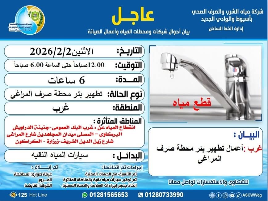 أعلنت شركة مياه الشرب والصرف الصحي بأسيوط والوادي الجديد عن انقطاع جزئي للمياه عن عدد من شوارع حي غرب أسيوط، لمدة 6 ساعات ليلًا، وذلك لتنفيذ أعمال تطهير بيارة محطة صرف صحي المراغي.