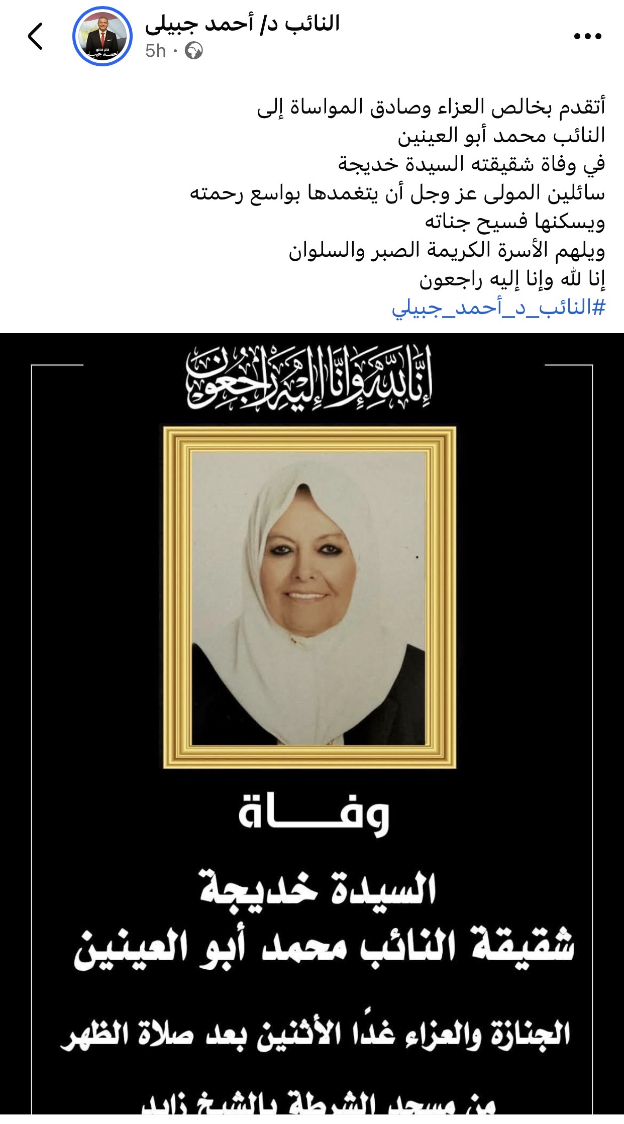 قدم النائب الدكتور أحمد جبيلي خالص العزاء وصادق المواساة إلى النائب محمد أبو العينين في وفاة شقيقته خديجة، داعيًا المولى عز وجل أن يتغمدها بواسع رحمته ويسكنها فسيح جناته.