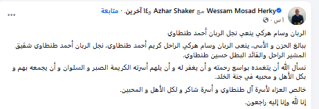 خيم الحزن على أسرة المشير الراحل محمد حسين طنطاوي، وزير الدفاع الأسبق، عقب الإعلان عن وفاة الشاب كريم، نجل القبطان أحمد طنطاوي، نجل شقيق المشير الراحل، وذلك في خبر مؤلم تلقته الأسرة ومحبوها.
