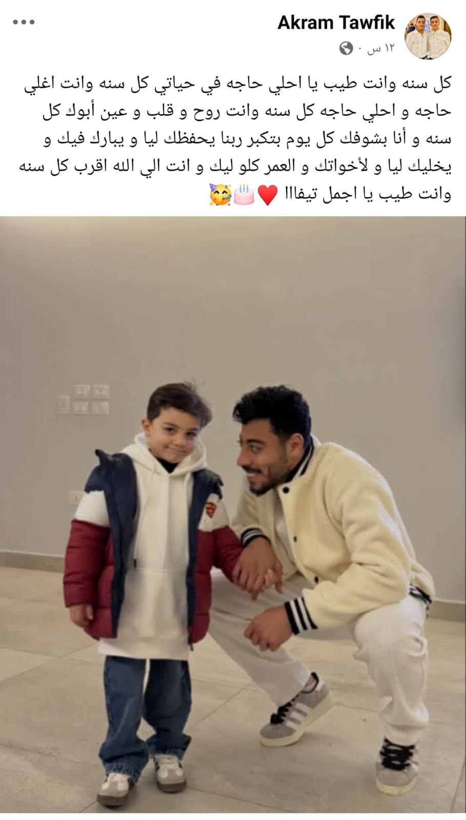 هنأ أكرم توفيق لاعب الأهلي السابق والشمال القطري الحالي، ابنه بمناسبة عيد ميلاده على صفحته الشخصية بموقع التواصل الإجتماعي فيسبوك.