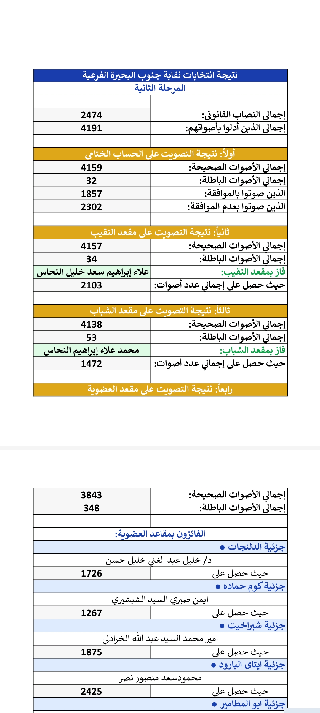 أعلنت اللجنة القضائية المشرفة على انتخابات النقابات الفرعية للمحامين، نتيجة المرحلة الثانية من العملية الانتخابية، وذلك عقب الانتهاء من أعمال الفرز ومراجعة الأصوات، في إطار من النزاهة والشفافية وتحت إشراف قضائي كامل.
