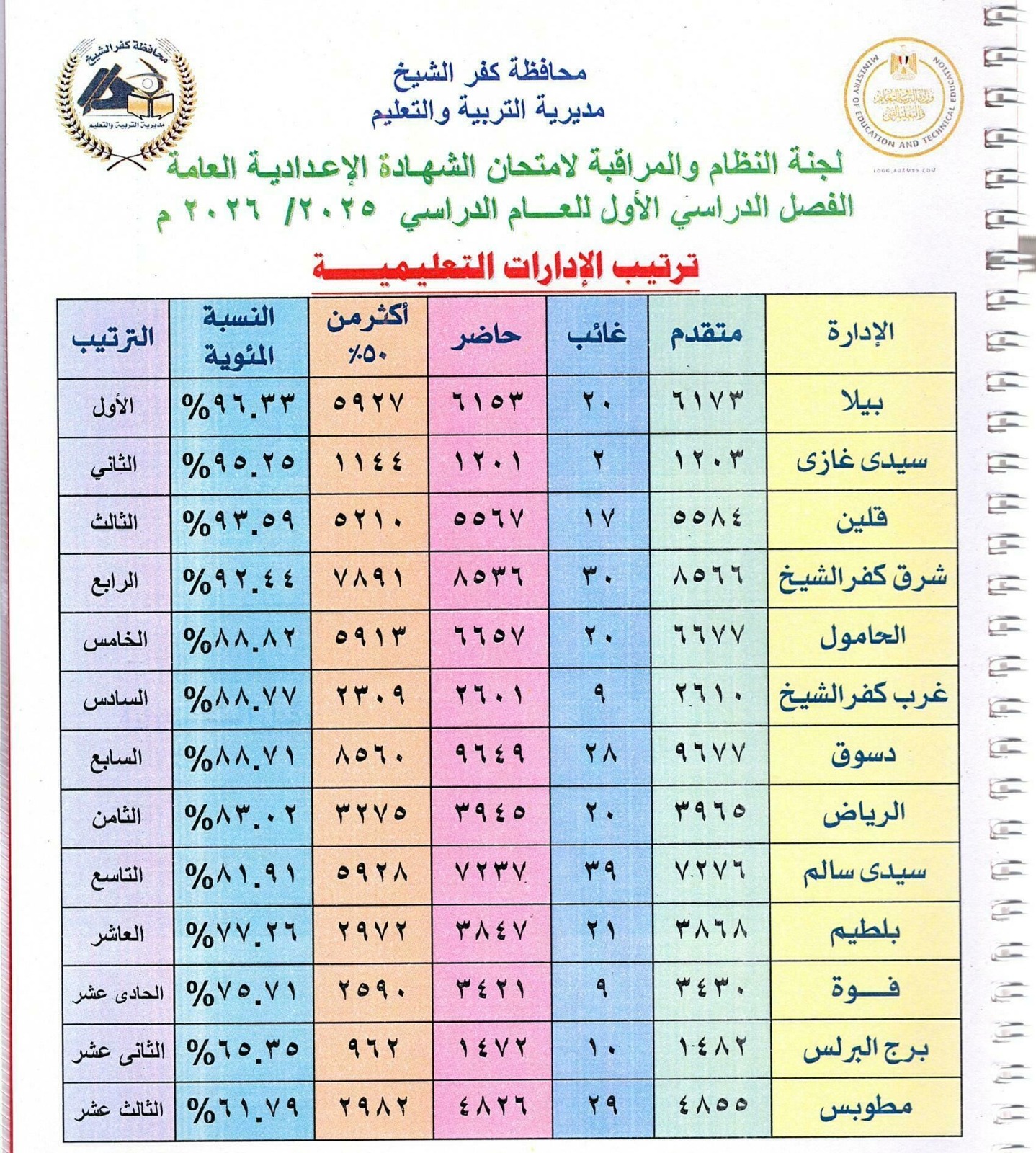 جاء ذلك بحضور الدكتور علاء جودة، وكيل وزارة التربية والتعليم بكفر الشيخ، ومحمد فاروق، وكيل مديرية التربية والتعليم، وهلال عبيد، رئيس لجنة النظام والمراقبة، والمهندس صلاح حسنين، مسؤول قواعد البيانات المركزية، وتامر وهدان، مدير التعليم الخاص، وأحمد أبوالفتوح، مدير التعليم الإعدادي، وهاني حمدان، مدير غرفة العمليات بالمديرية، وعبدالفتاح نصار، مسؤول قاعدة بيانات كنترول المهني، وعدد من القيادات التنفيذية.