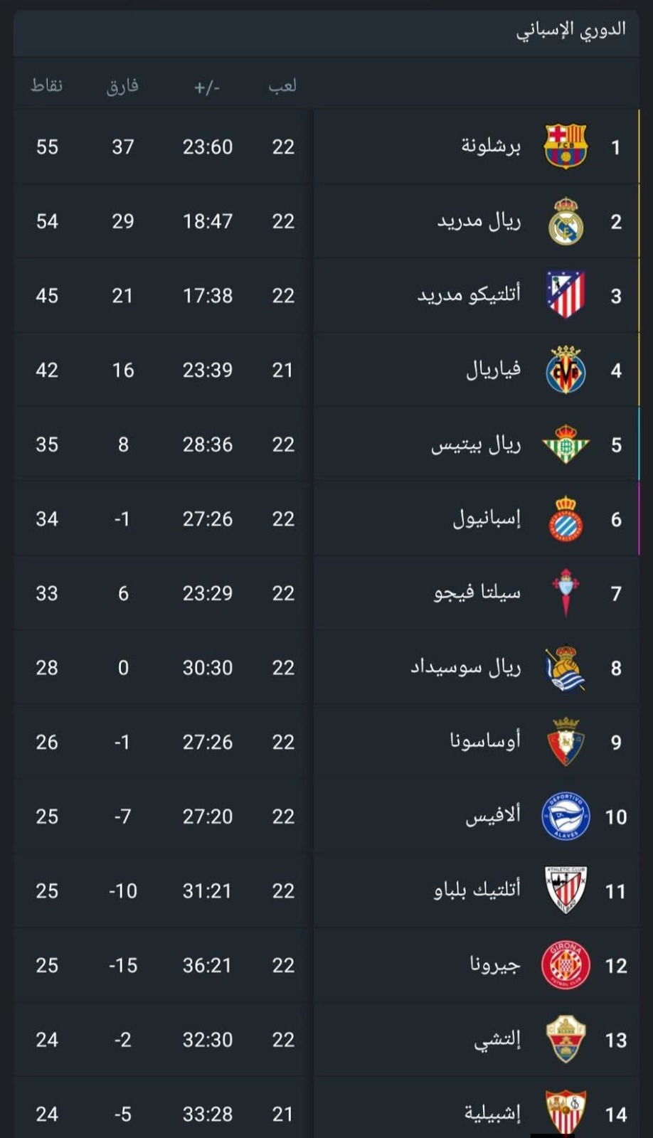 جدول ترتيب الدوري الإسباني بعد الجولة 22: