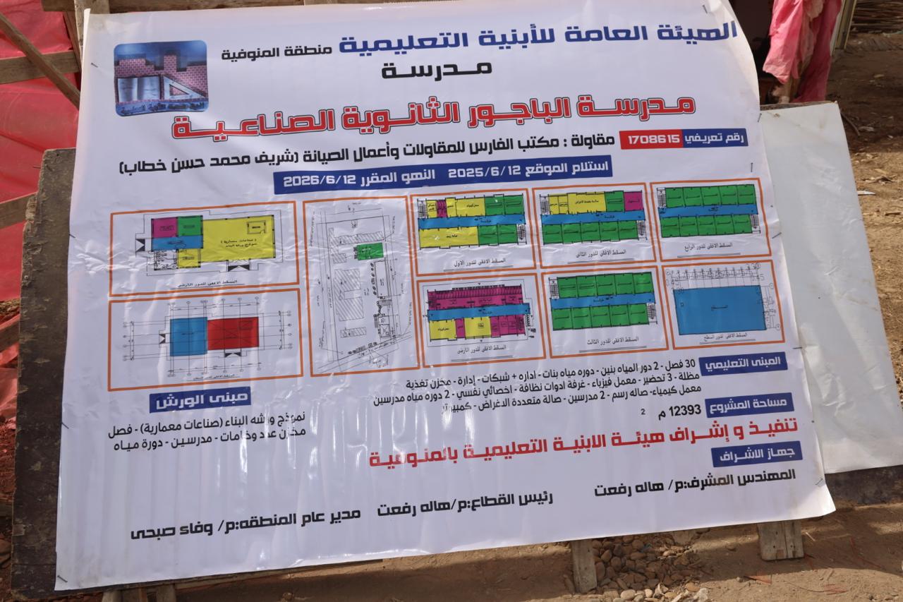 كما تضمنت الجولة، تفقد محافظ المنوفية أعمال إنشاءات مدرسة الباجور الثانوية الصناعية "إحلال جزئي وصيانة " بإجمالي 30 فصل دراسي و باستثمارات تزيد عن 28 مليون جنيه، ووجه المحافظ بفتح اقسام جديدة تتضمن قسم طاقة متجددة (طاقة شمسية - طاقة الرياح) ،وقسم للمشغولات الذهبية .