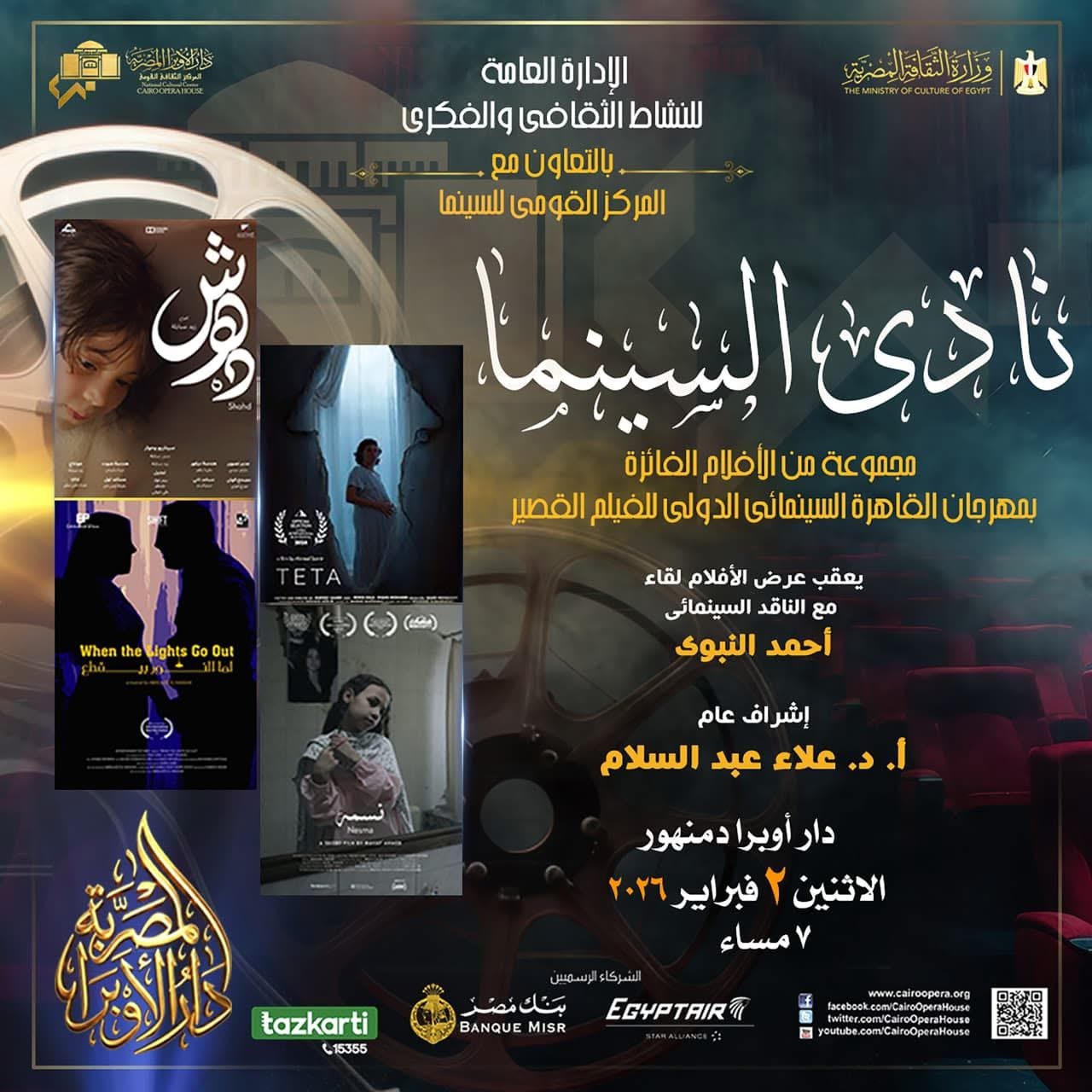 تقدم دار الأوبرا المصرية برئاسة الدكتور علاء عبد السلام ضمن نشاطها الثقافى والفكرى وعروض نادى السينما بإشراف رشا الفقى وهو بالتعاون مع المركز القومى للسينما مجموعة مختارة من الأفلام المصرية والأردنية الفائزة فى مهرجان القاهرة السينمائى الدولى للفيلم القصير وذلك فى السابعة مساء الإثنين ٢ فبراير على مسرح أوبرا دمنهور .
