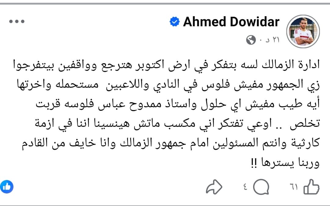 وكتب دويدار عبر حسابه علي فيسبوك "ادارة الزمالك لسه بتفكر في ارض اكتوبر هترجع وواقفين بيتفرجوا زي الجمهور مفيش فلوس في النادي واللاعبين مستحمله واخرتها أيه طيب مفيش اي حلول واستاذ ممدوح عباس فلوسه قربت تخلص.