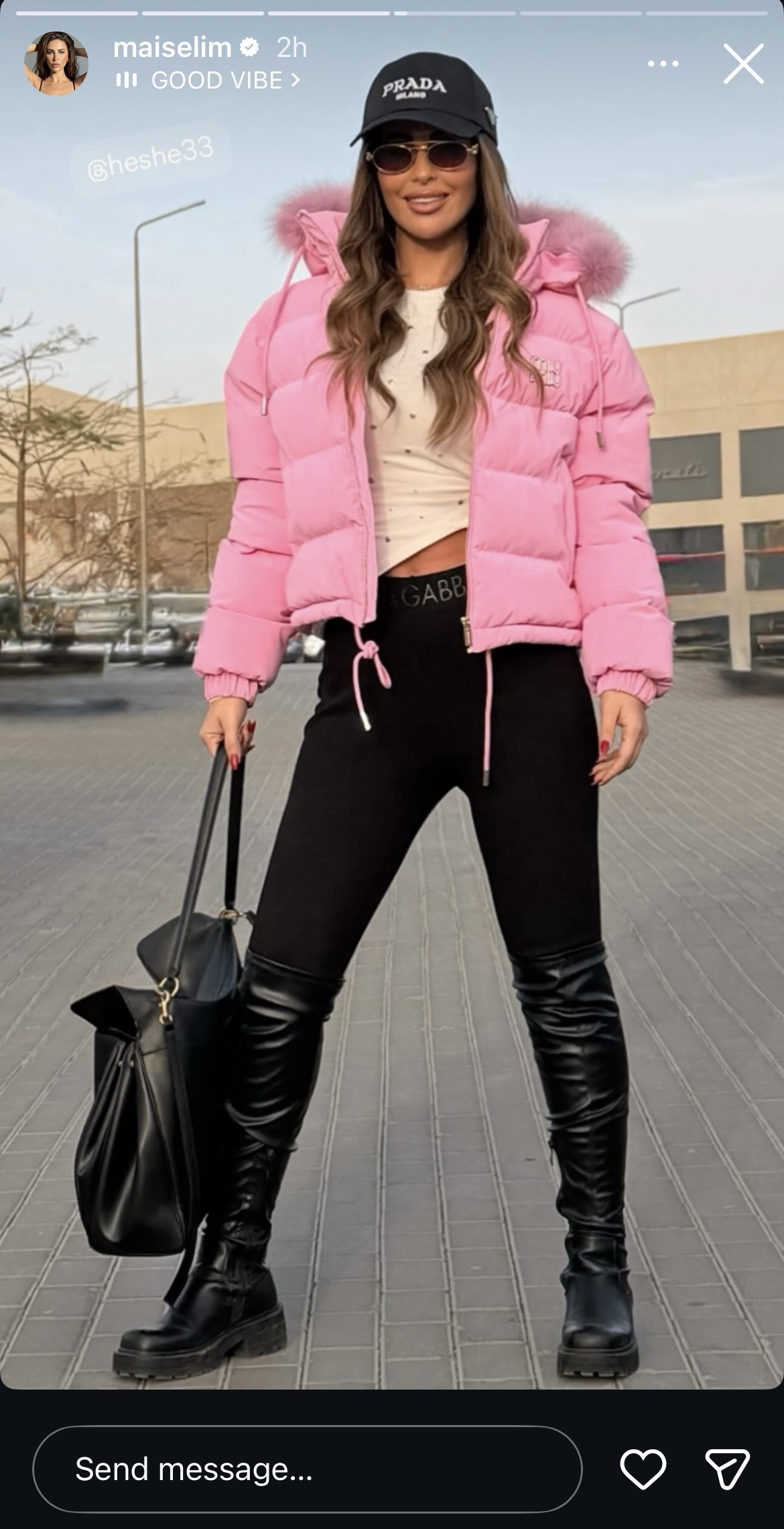 وتألقت مي سليم بإطلالة شتوية أنيقة كاجوال، وارتدت جاكيت وردي وليجن أسود، وحذاء جلد أسود طويل.