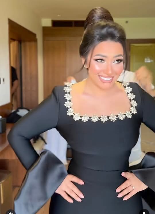 الفستان الذي أصبح حديث السوشيال ميديا يتميز بقصّة أنثوية واضحة، حيث جاء باللون الأسود الكلاسيكي، مع تصميم مكشوف الصدر يبرز الرقبة وعظمة الترقوة، بينما تتوزع الفصوص البيضاء على منطقة الصدر بشكل أنيق، ما يمنح الإطلالة توازنًا بين الجرأة والرقي، ويجعل الفستان قطعة لافتة لا تمر مرور الكرام.