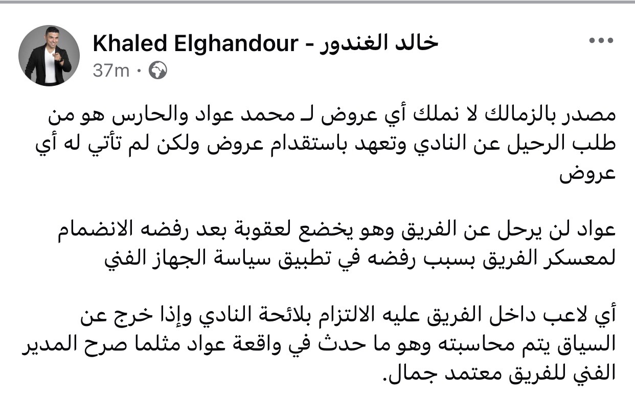 وكتب الغندور عبر حسابه الشخصي بموقع فيسبوك: “مصدر بالزمالك لا نملك أي عروض لـ محمد عواد والحارس هو من طلب الرحيل عن النادي وتعهد باستقدام عروض ولكن لم تأت له أي عروض”.