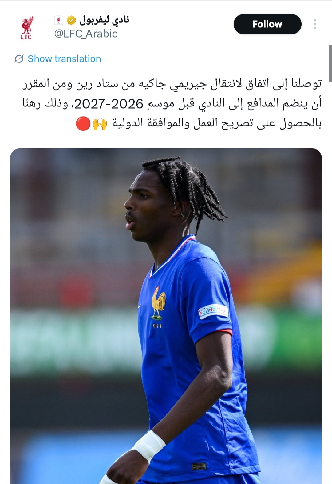 وأوضح النادي الإنجليزي عبر حسابه الرسمي ، أن جاكيه سيواصل مشواره مع رين حتى نهاية الموسم الجاري في الدوري الفرنسي، قبل أن ينتقل إلى ملعب أنفيلد خلال فترة الانتقالات الصيفية المقبلة، بموجب عقد يمتد لعدة مواسم.