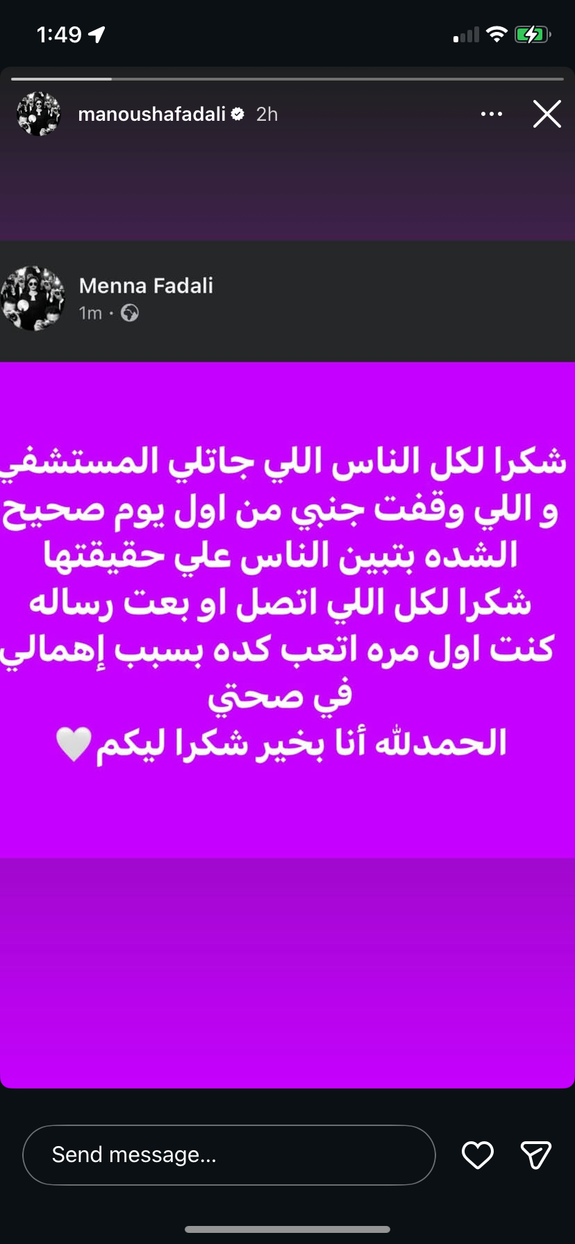 واضافت :"كنت أول مرة اتعب كده بسبب إهمالي في صحتي، الحمدلله أنا بخير شكراً ليكم".