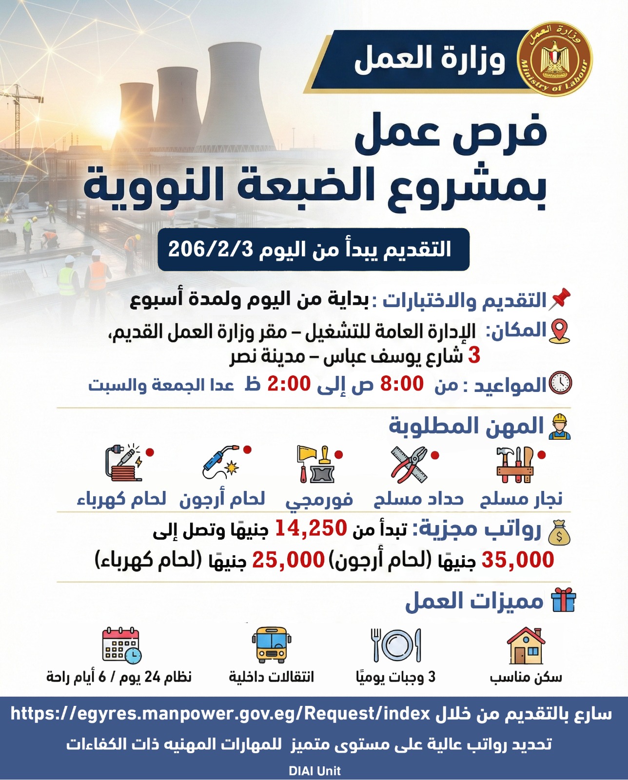 وأكد وزير العمل محمد جبران أن مشروع الضبعة النووية يُعد أحد أهم المشروعات الاستراتيجية القومية، ويوفر فرص عمل حقيقية ومستقرة برواتب مجزية، مشددًا على حرص الوزارة على اختيار العمالة الفنية الماهرة وفق معايير دقيقة تضمن جودة التنفيذ وتحقيق أعلى معدلات السلامة المهنية داخل مواقع العمل.