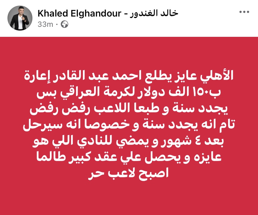 وكتب خالد الغندور :"الأهلي عايز يطلع احمد عبد القادر إعارة ب١٥٠ الف دولار لكرمة العراقي بس يجدد سنة و طبعا اللاعب رفض رفض تام انه يجدد سنة و خصوصا انه سيرحل بعد ٤ شهور و يمضي للنادي اللي هو عايزه و يحصل علي عقد كبير طالما اصبح لاعب حر".