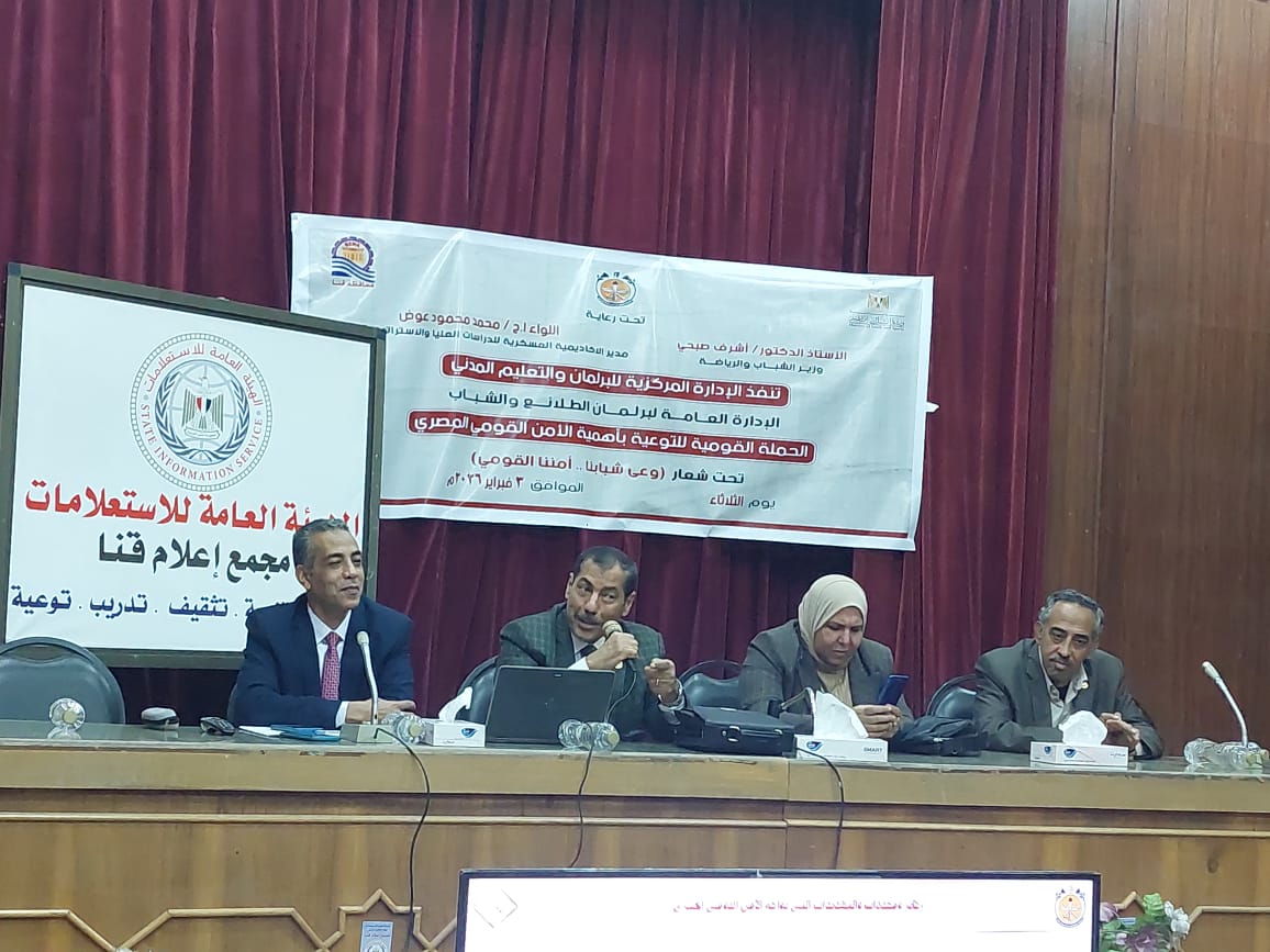 وقدم مدير مجمع إعلام قنا، الشكر لوزارة الشباب والرياضة لهذه الفعالية الهامة، التى تأتى فى وقت عصيب، فى وقت تحتاج فيه بلادنا إلى الوعى الحقيقى بتداعيات الأحداث العالمية وما يحاك ضد بلادنا، فى وقت تزايد فيه اعتماد الشباب على مواقع التواصل الاجتماعى، والتى باتت تبث سموم اليأس والإحباط أكثر مما تقدم نفعاً، وهو ضمن ما يُعرف بحروب الجيل الرابع التى تستهدف زعزعة الاستقرار داخلياً، ومثنياً على الأكاديمية العسكرية للدراسات العليا والإستراتيجية، التى تحمل على عاتقها توعية المواطنين من كافة الفئات بأبعاد وتداعيات الأمن القومى المصرى، من خلال برامج وتدريبات متخصصة.