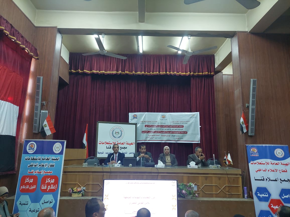 حاضر فيها اللواء أ. ح حسام الدين أنور.. المحاضر بالأكاديمية العسكرية للدراسات العليا والإستراتيجية، بحضور إيمان عبدالجابر.. وكيل الوزارة ورئيس الإدارة المركزية للبرلمان والتعليم المدنى، وبهاء أحمد شوقى.. وكيل وزارة الشباب والرياضة بقنا، والاعلامى يوسف رجب، مدير مجمع إعلام قنا، وهانى محمد، وكيل المديرية للشباب، ولفيف من الإعلاميين والقيادات المجتمعية.